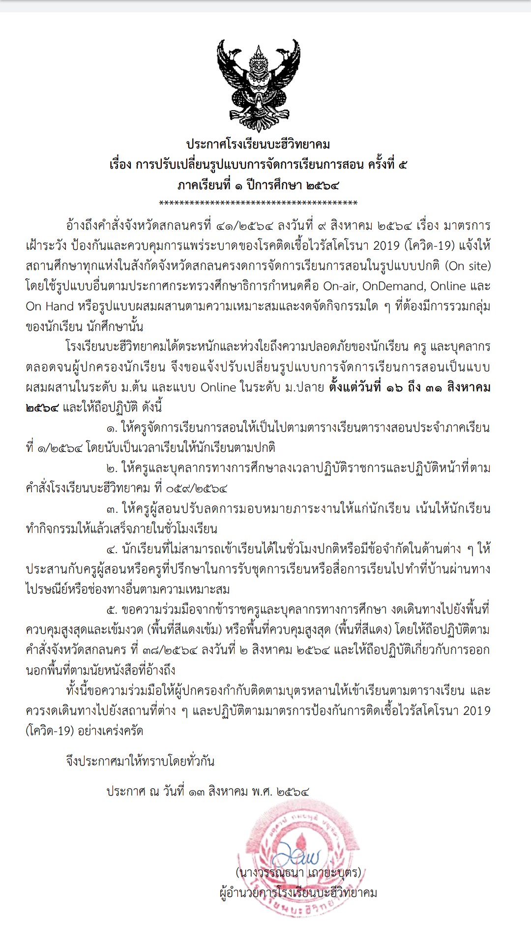 ประกาศปรับเปลี่ยนการเรียนการสอน ครั้งที่ 5