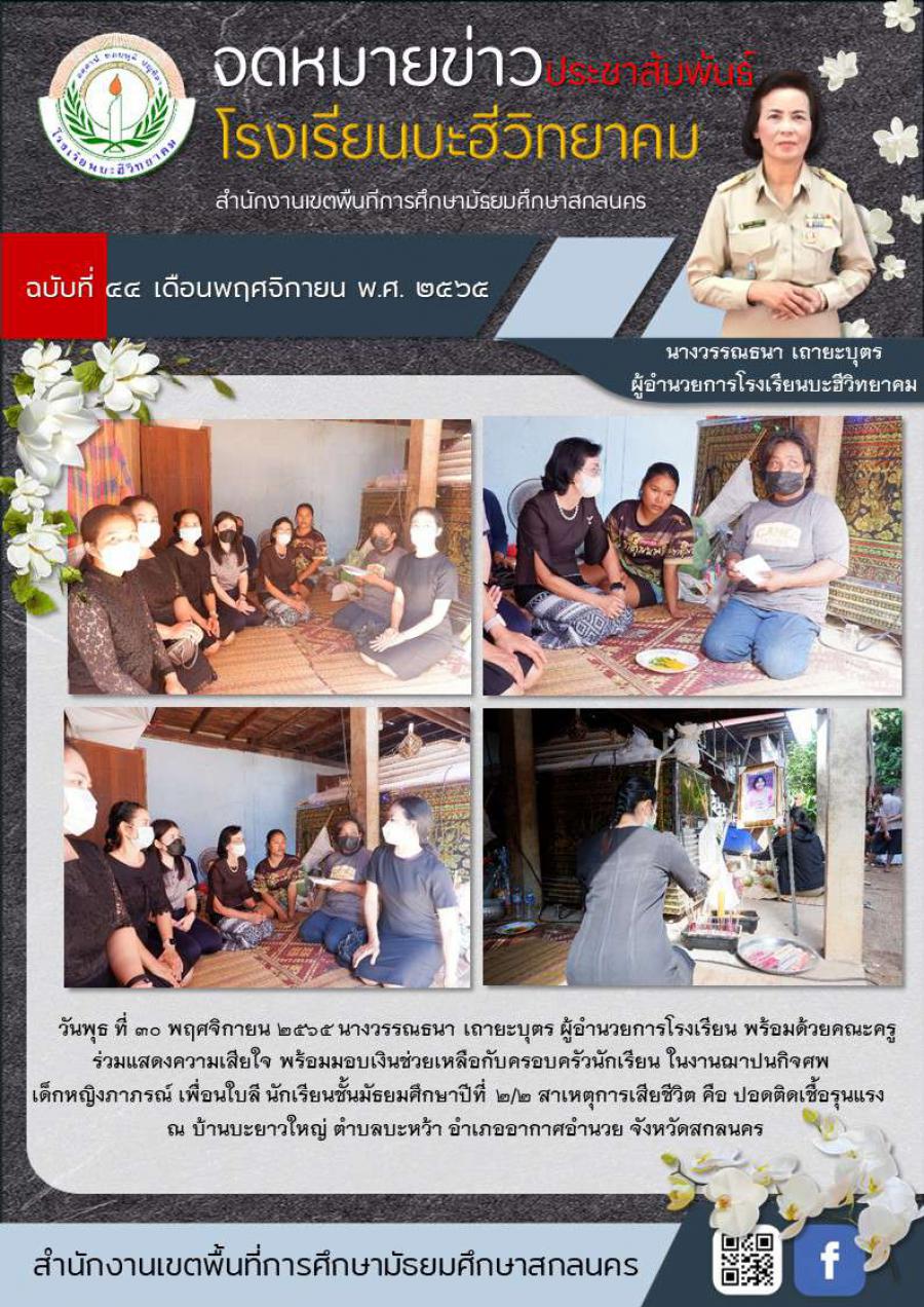 ฉบับที่ 44/2565 ร่วมแสดงความเสียใจ พร้อมมอบเงินช่วยเหลือกับครอบครัวนักเรียนในงานฌาปนกิจศพ